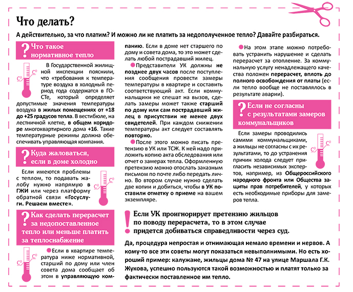 С началом отопительного сезона в квитанциях появилась достаточно внушительная сумма за отопление. Но недавние крепкие морозы показали, что не все дома региона обеспечены нормативным теплом. В областном центре, например, люди мерзли в домах на улицах Гурьянова и Салтыкова-Щедрина, где в эти дни произошли аварии на двух котельных. Было холодно и в квартирах многих других домов. До конца отопительного сезона еще далеко – капризный февраль может показать, почем фунт лиха. Что делать тем, кто недоволен качеством услуги?