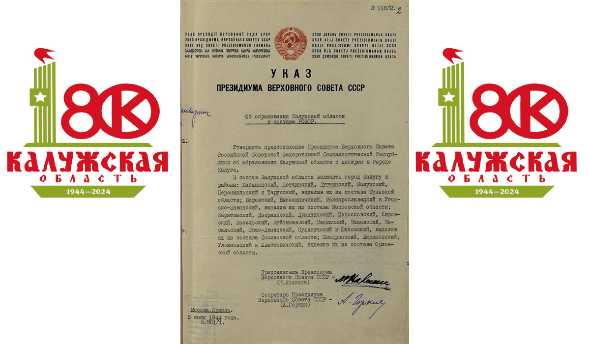День образования региона — точка отсчета новейшей истории нашей области. 5 июля 1944 года согласно Указу Президиума Верховного Совета в целях более быстрого восстановления хозяйства и лучшего обслуживания трудящихся из 27 районов, выделенных из состава Тульской, Московской, Смоленской и Орловской областей, была сформирована Калужская область. Судьбоносный указ и по сей день хранится в Государственном архиве. В преддверии 80-летия здесь открылась новая выставка «Документальные раритеты Калужской области».