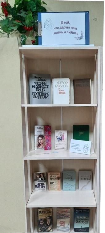На ней представлены книги отечественных и зарубежных авторов, которые создавали в своих произведениях образ матери — любящей и доброй, понимающей и всепрощающей, женственной, стойкой в горе, открытой и щедрой в радости.