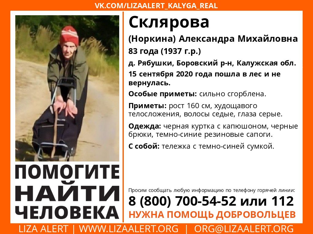 Особые приметы: рост 160 см, сильно сгорблена, худощавая, седые волосы, серые глаза. Была одета в черную куртку, черные брюки и темно-синие резиновые сапоги. С собой была тележка с темно-синей сумкой.