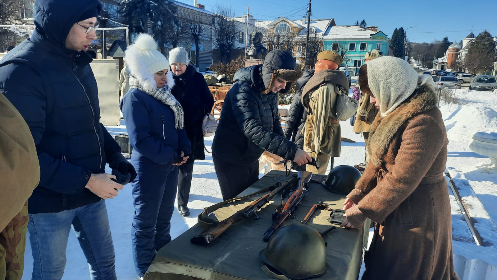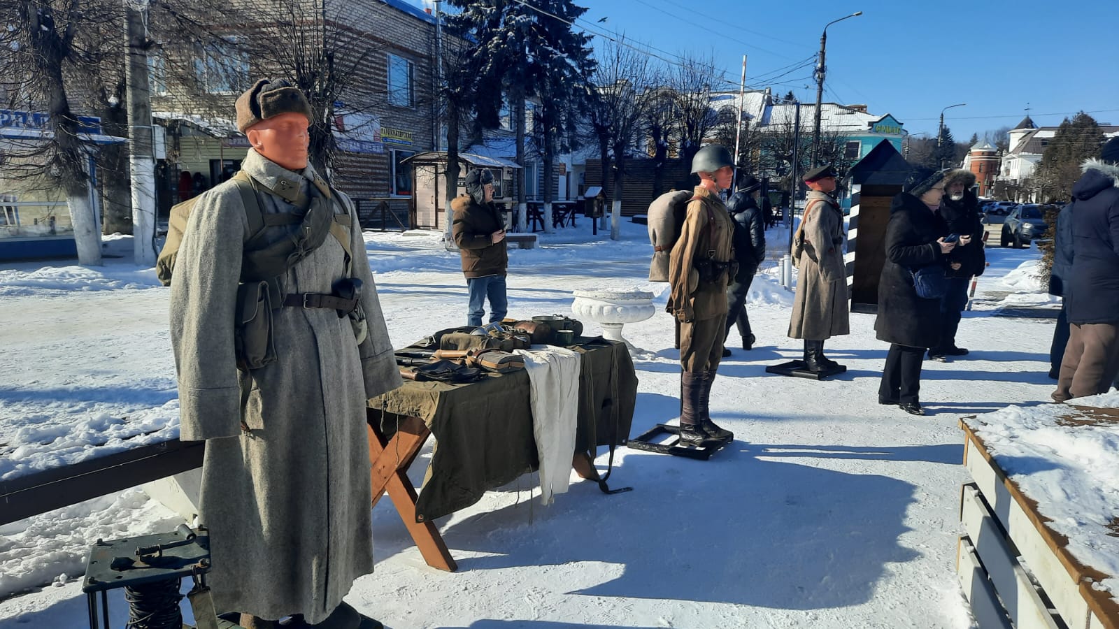 Выставку на городской площади у представляет клуб исторической реконструкции «Калужский гарнизон» и его руководитель Дмитрий Чупров. Она посвящена Красной армии в годы Великой Отечественной войны.