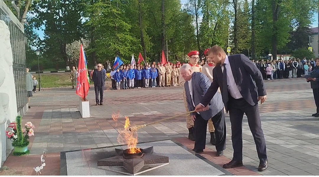 «»«Сегодня дело дедов и прадедов продолжают бойцы специальной военной операции, среди которых и наши земляки. А наш долг - делать всё для Победы над неонацистами здесь, в тылу», - сказал руководитель района.Почётное право зажечь Вечный огонь предоставили Сергею Булыгину и бывшему председателю районного Совета ветеранов Николаю Гончарову, который выполнил эту миссию и 8 мая 2015 года.