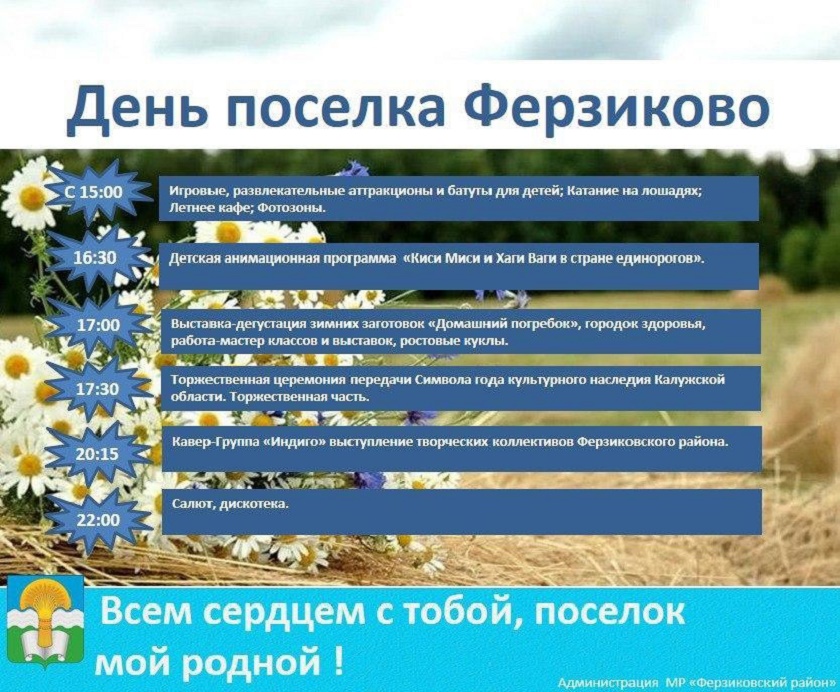Для жителей и гостей поселка подготовили разнообразную программу. В 15.00 начнут свою работу игровые и развлекательные аттракционы для детей, батуты, летнее кафе, фотозоны, а так же появится возможность прокатится на лошади. В 16.30 запланирована детская анимационная программа «Киси Миси и Хаги Ваги в стране единорогов». В 17.00 откроются дегустационная выставка зимних заготовок «Домашний погребок» и городок здоровья. В это же время начнут проводить мастер-классы и выставки, появятся ростовые куклы. На 17.30 запланирована торжественная часть, где пройдет церемония передачи Символа города культурного наследия Калужской области. После нее, в 20.15 выступит кавер-группа «Индиго». А завершится мероприятие праздничным салютом и дискотекой в 22.00.