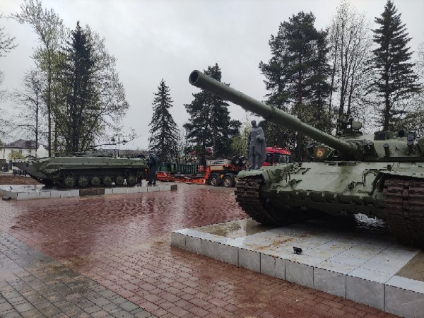 Утром 8 мая в парк прибыла первая единица – боевая машина пехоты (БМП-1). Подготовка заняла длительное время, но вот через два часа трудоемких работ она уже красуется на постаменте. Вторая боевая машина – танк Т-80 прибыла чуть позже и была установлена справа от памятника Советскому Солдату.