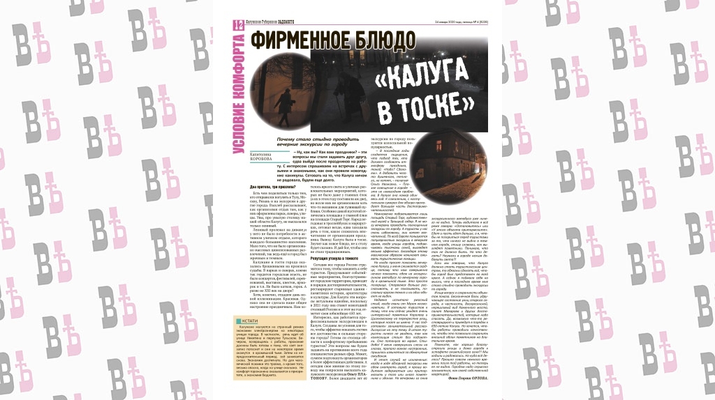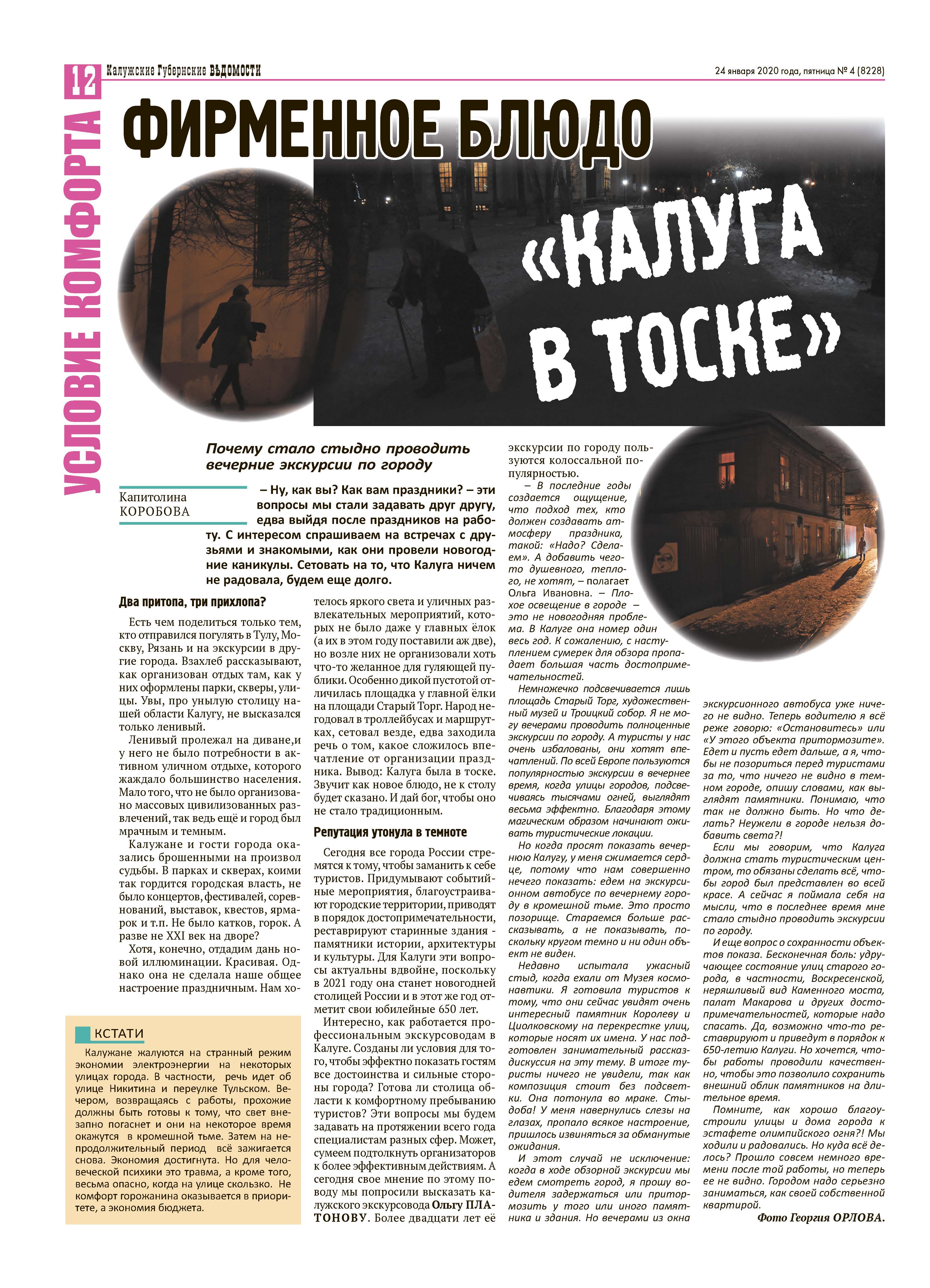 Поводом для этого послужила публикация в «КГВ» «Фирменное блюдо «Калуга в тоске», где говорилось о том, что в областном центре, с точки зрения экскурсовода, вечером плохо подсвечиваются значимые архитектурные сооружения. Кроме того, калужане часто жалуются на странный режим освещения, например, улицы Никитина и Тульского переулка.