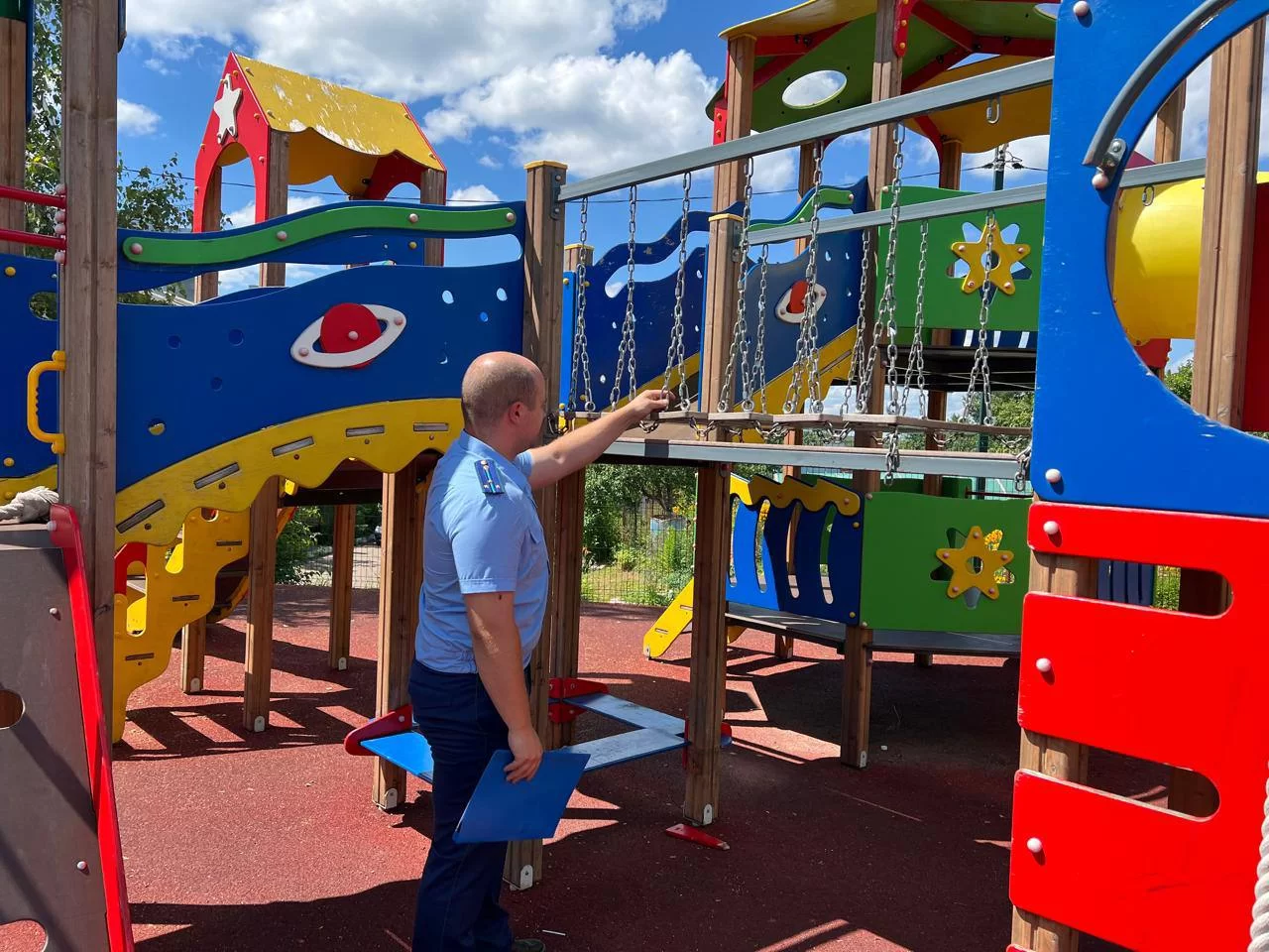 Районная прокуратура провела проверку детской площадки в одном из сел Износковского района. Выяснилось, что оборудование находилось в ненадлежащем состоянии. Так, были обнаружены острые металлические штыри, сколы деревянных элементов, отслоение лака и не струганные доски.
