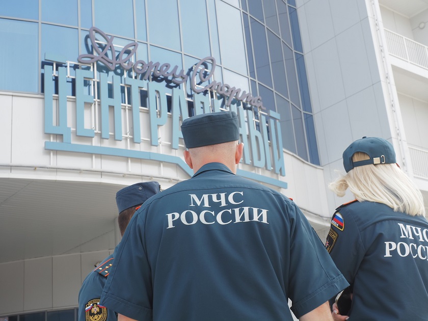 Все люди находятся на улице, входы в спорткомплекс перекрыты. Осуществляется проверка всех помещений здания.