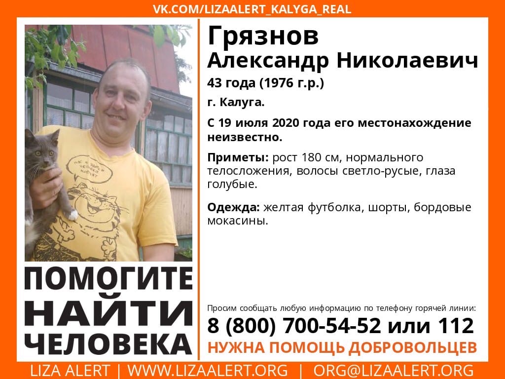 Как сообщает калужский отряд «Лиза Алерт», в областном центре пропал Грязнов Александр Николаевич, 43 года.