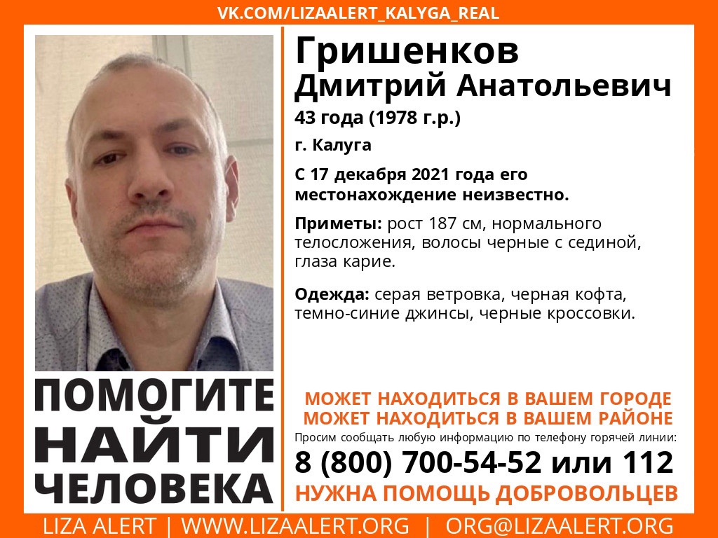 В поисковом отряде «ЛизаАлерт» сообщили о поисках Дмитрия Гришенкова. Мужчине 43 года, в пятницу, 17 декабря, он ушел из дома в неизвестном направлении.