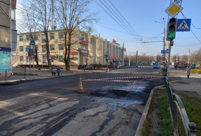 Верхний слой асфальта на перекрестке улиц Жукова – Энгельса сняли из-за ям. Дорожникам не хватило времени уложить новый асфальт до понедельника. Работы должны закончиться в ближайшее время.
