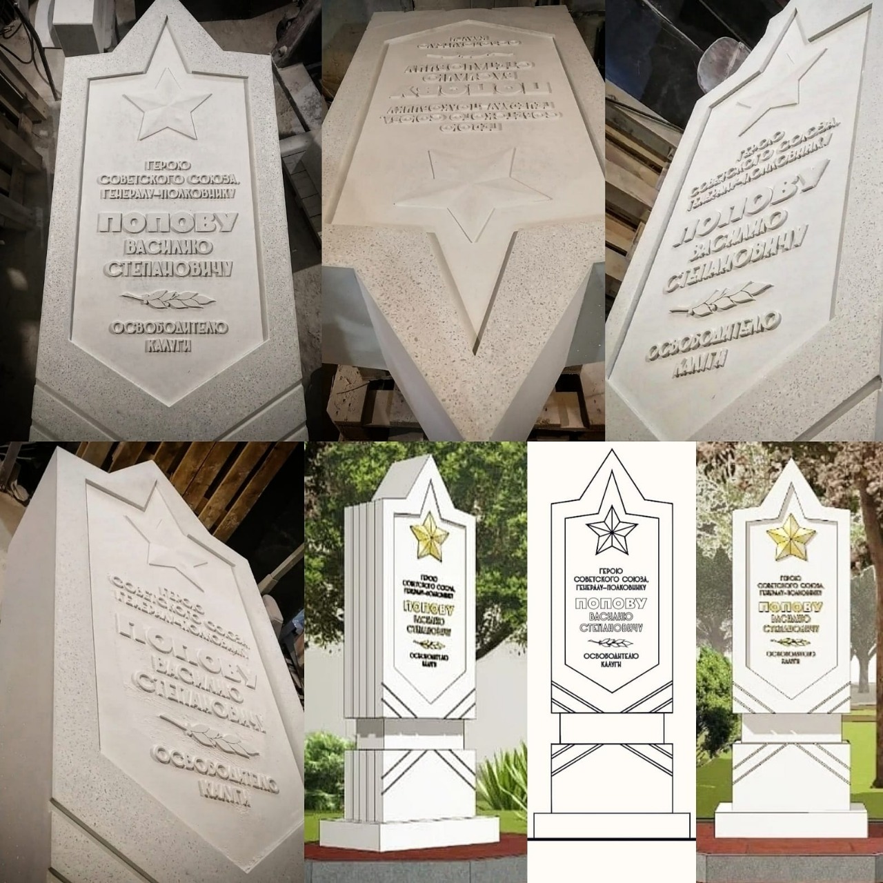 «Памятный знак уже отлит на калужском предприятии «Пальмира» по технологии «литой мрамор» - высокопрочный белый бетон мелкой фракции с добавлением мраморной крошки», - пишет Алексей Комов.