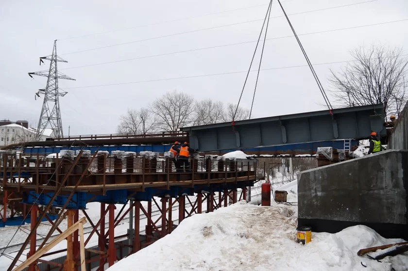 На данный момент начался монтаж металлического пролётного строения над железной дорогой. По словам градоначальника, первую балку крайней опоры путепровода уже установили при помощи многотонного подъёмного крана. Всего их будет 32, а консольных плит – 8. Планируется, что мост сможет выдерживать нагрузку до 14 тонн.