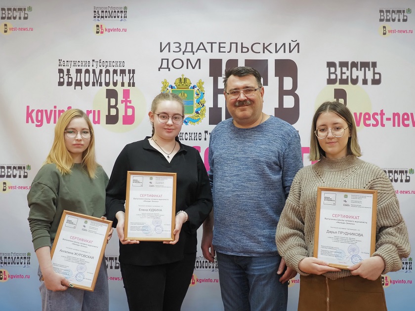 Сегодня сертификаты об окончании школы журналиста выпускникам «Молодо-Зелено» из Калуги вручил председатель Калужской региональной организации Союза журналистов России, директор издательского дома «КГВ» Юрий Расторгуев. Их получили Дарья Прудникова, Ангелина Журовская и Елена Юдкина.