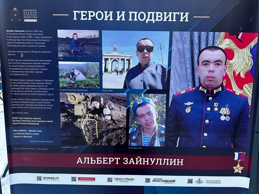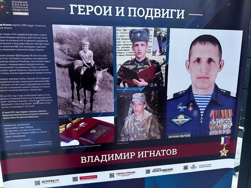 Экспозиция рассказывает истории подвига более 30 героев нашей страны, среди которых, в частности, калужанин Владимир Игнатов. Уроженец козельской земли, гвардии старший сержант, командир отделения 45-ой отдельной бригады специального назначения ВДВ находился на Украине на освобождаемых от националистов территориях с начала специальной военной операции. 30 мая 2022 года в ходе освобождения одного из сел на Донбассе он ценой своей жизни спас боевых товарищей.