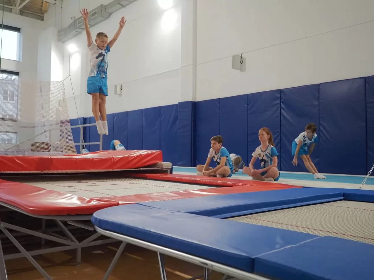 В зале наземной подготовки одновременно могут заниматься хореографией, акробатикой и гимнастикой около 40 детей. В зале - два батута, акробатическая дорожка, три трамплина, углубления с поролоном. Здесь могут тренироваться и представители других видов спорта.