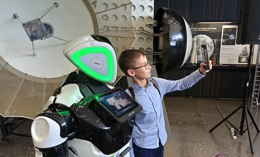 Также с приветствием к гостям музея обратился расхаживающий по залу робот по имени Космогид. Он охотно общался, заводил разговор, отвечал на вопросы и вообще излучал дружелюбие (на самом деле он не шагал, а ездил на колёсиках). Дети постоянно его окружали и делали с ним селфи.