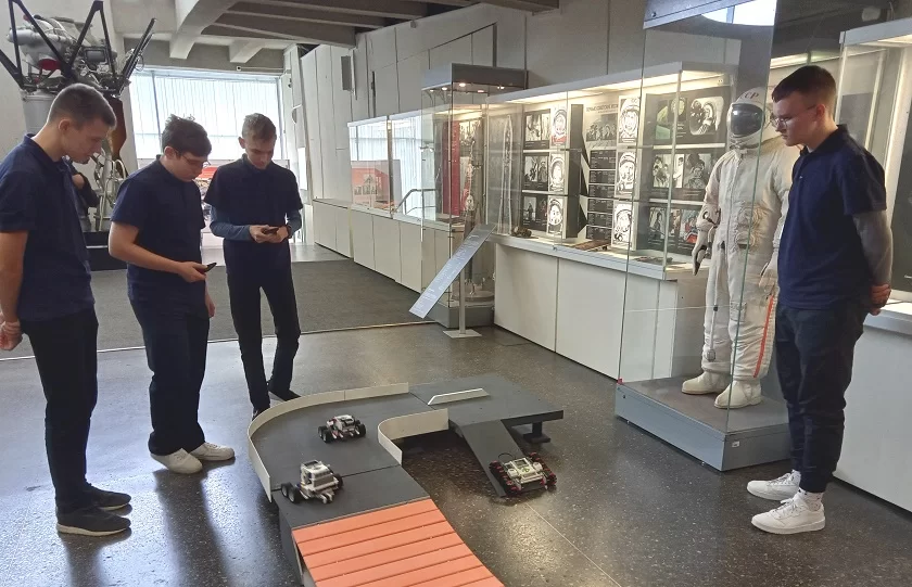 После этого состоялись показательные соревнования изделий юных роботостроителей, уже в очном формате. Их машины состязались на специальной трассе в скорости и точности – они должны быть очень послушными своим создателям.