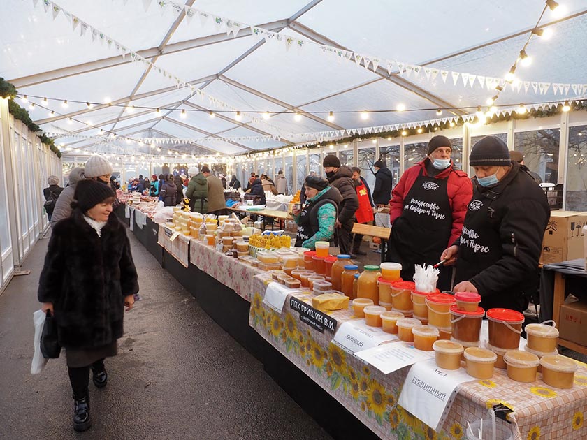 Рядом с областной ТПП Агентство развития бизнеса, организовавшее эту ярмарку, установило большой павильон. Здесь можно купить молочные продукты, мед, мясо, колбасы, рыбу – от простых повседневных продуктов до деликатесов.