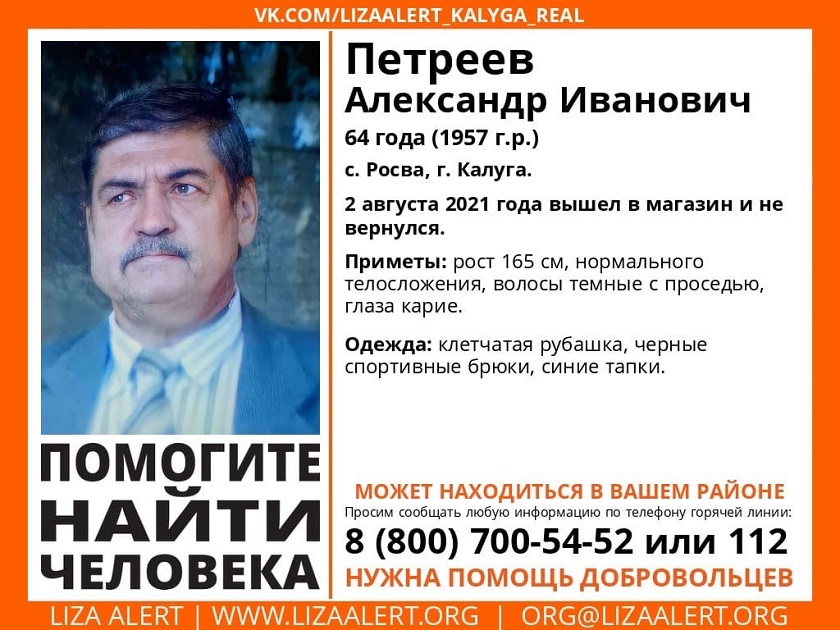 В объявлении сообщается, что Александр Иванович Петреев 2 августа вышел в магазин и не вернулся. Рост калужанина – 165 см, нормальное телосложение, темные с проседью волосы, карие глаза. Одет Александр Иванович был в клетчатую рубашку, черные спортивные брюки и синие тапки.