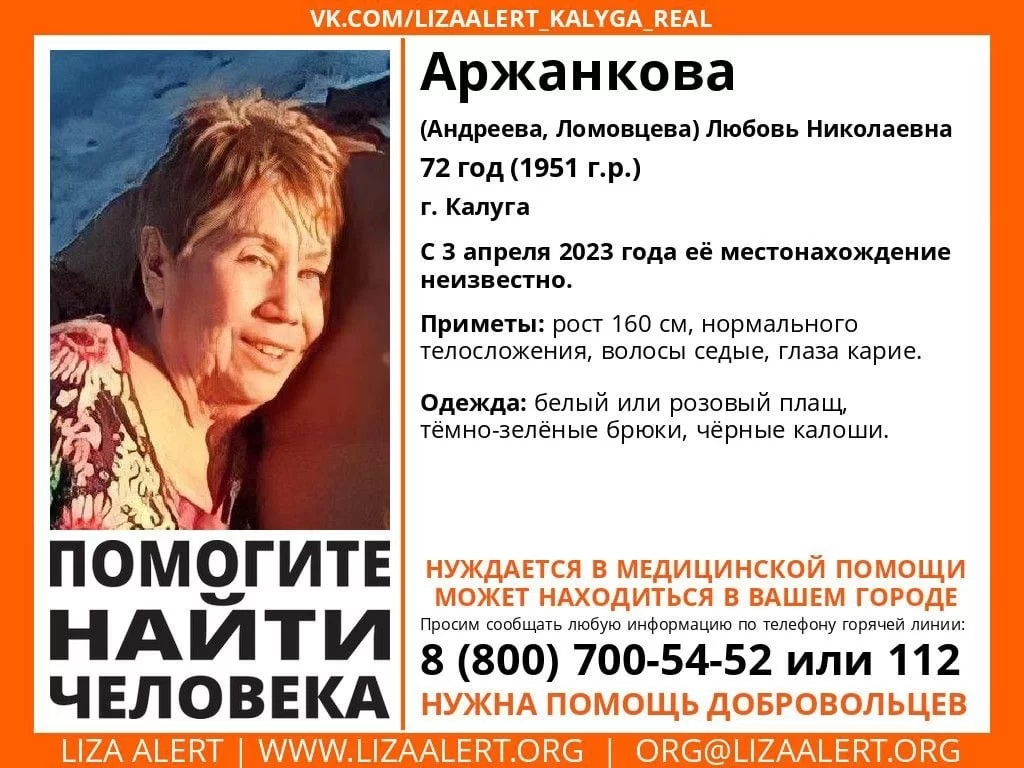 Всех калужан, кто видел пенсионерку, просят сообщать любую информацию о ее местонахождении по телефону горячей линии поисково-спасательного отряда 8 800 700-54-52.