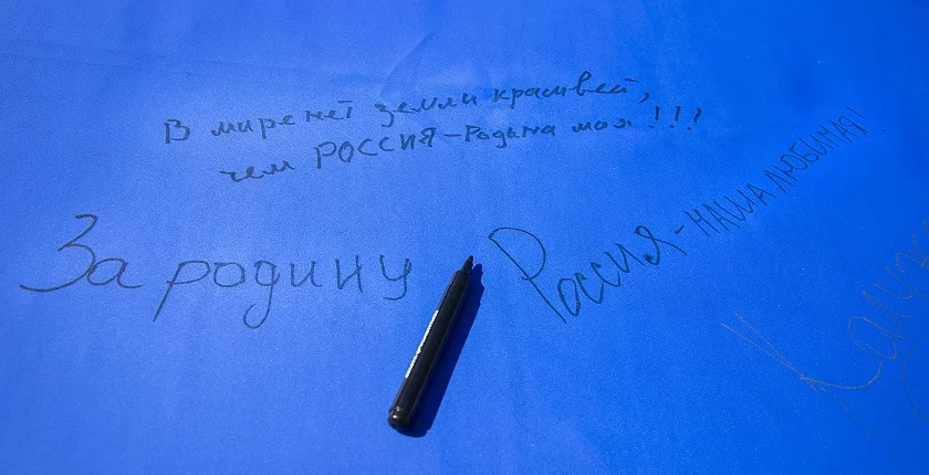Во флешмобе приняли участие волонтеры и молодежь, юнармейцы, члены Общественной палаты области, неравнодушные калужане. На небольшом фрагменте российского флага каждому требовалось написать какие-либо фразы-пожелания, патриотичные слова.
