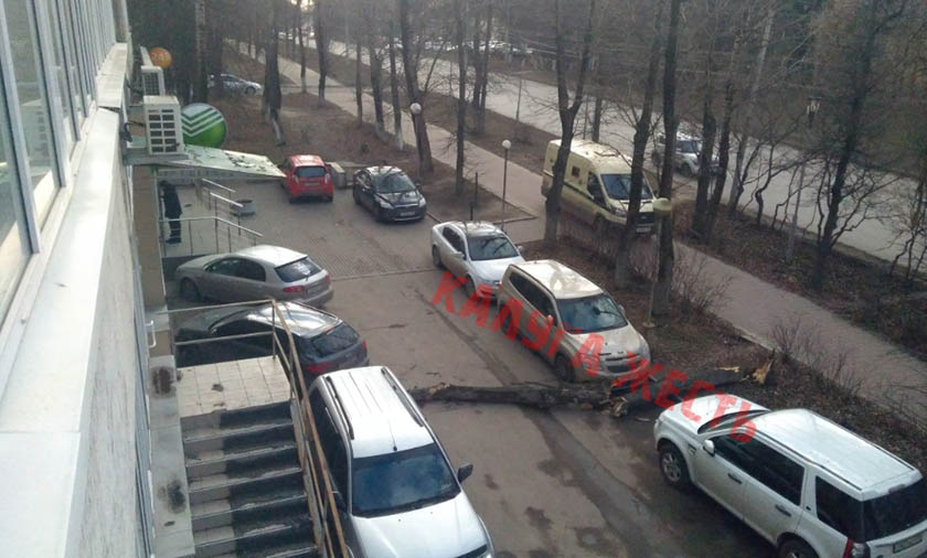 Возле административного здания ОАО «КАДВИ» упало дерево, перегородив выезд в парковки отделения Сбербанка, расположенного в этом здании.