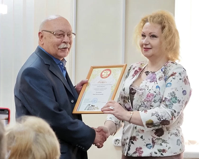 Майя Добычина вручила Льву Лисицыну Почетную грамоту Управления по делам архивов за личный вклад и активное участие в формировании архивного фонда Российской Федерации, а также фирменный подарок – эксклюзивный чайный сервиз, который был выпущен по случаю 100-летия государственной архивной службы России.