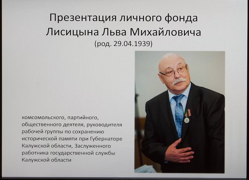Принимая этот ценный дар на хранение, директор Государственный архив документов новейшей истории Калужской области Петр Симоненко, выразил огромную благодарность Льву Лисицыну за этот подарок. Он подчеркнул, что в этих документах история страны и нашей области переплетается с биографией и активной деятельностью дарителя. Благодаря этому материалу новые поколения наших земляков узнают об истории и событиях, которые происходили в Калуге и области.