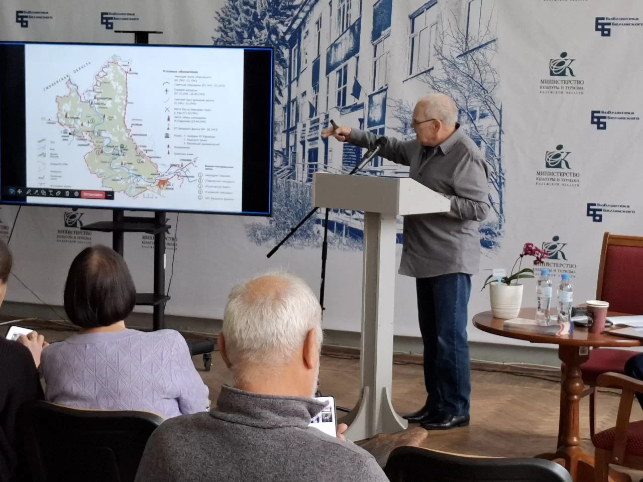 Национальный парк «Угра» выступил организатором этой встречи. Хозяевам есть, чем поделиться с гостями. С первым докладом выступил Валерий Новиков, главный научный сотрудник нацпарка «Угра». Он рассказал о ландшафтном мемориальном музее «Угра -Фронт». Эта территория 15 на 30 километров в западной части парка была в 1941- 1943 годах единым полем сражения. К настоящему времени здесь проложено пять военно-мемориальных троп.