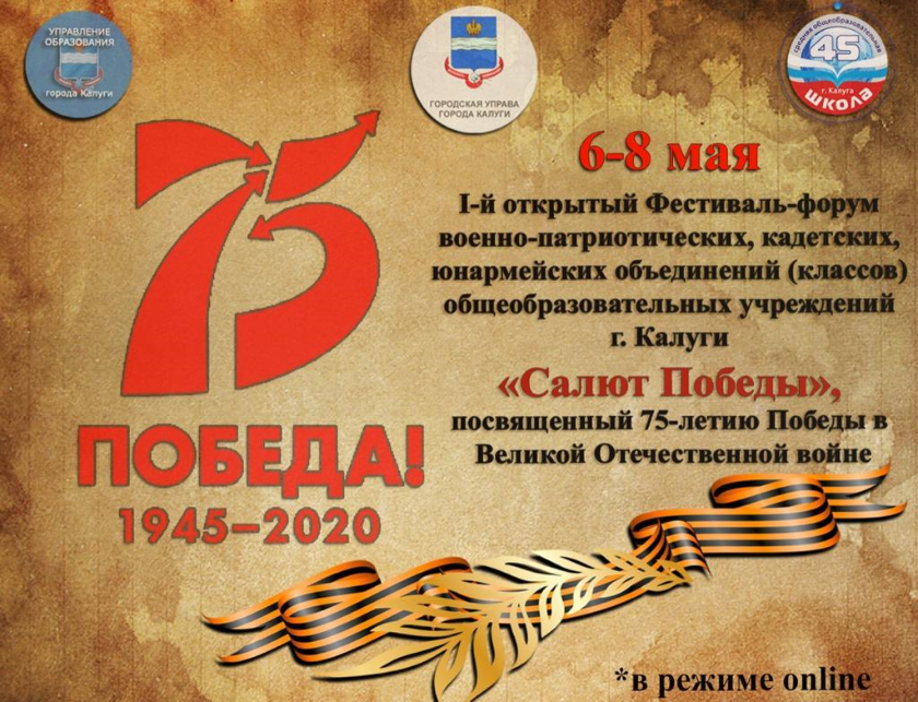 Сегодня первый день работы открытого онлайн фестиваля-форума военно-патриотических, кадетских, юнармейских объединений (классов) общеобразовательных учреждений Калуги «Салют Победы», он посвященн 75-летию Победы в Великой Отечественной войне.