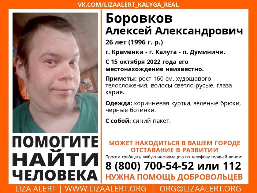 15 октября мужчина покинул дом и не вернулся. Алексей Боровков ростом 160 сантиметров, худощавого телосложения, со светло-русыми волосами и карими глазами. В день исчезновения был одет в коричневую куртку, зеленые брюки и черные ботинки. При себе имеет синий пакет. Мужчина отстает в развитии. В ориентировке говорится, что он может находиться в Кременках, Калуге или Думиничах.