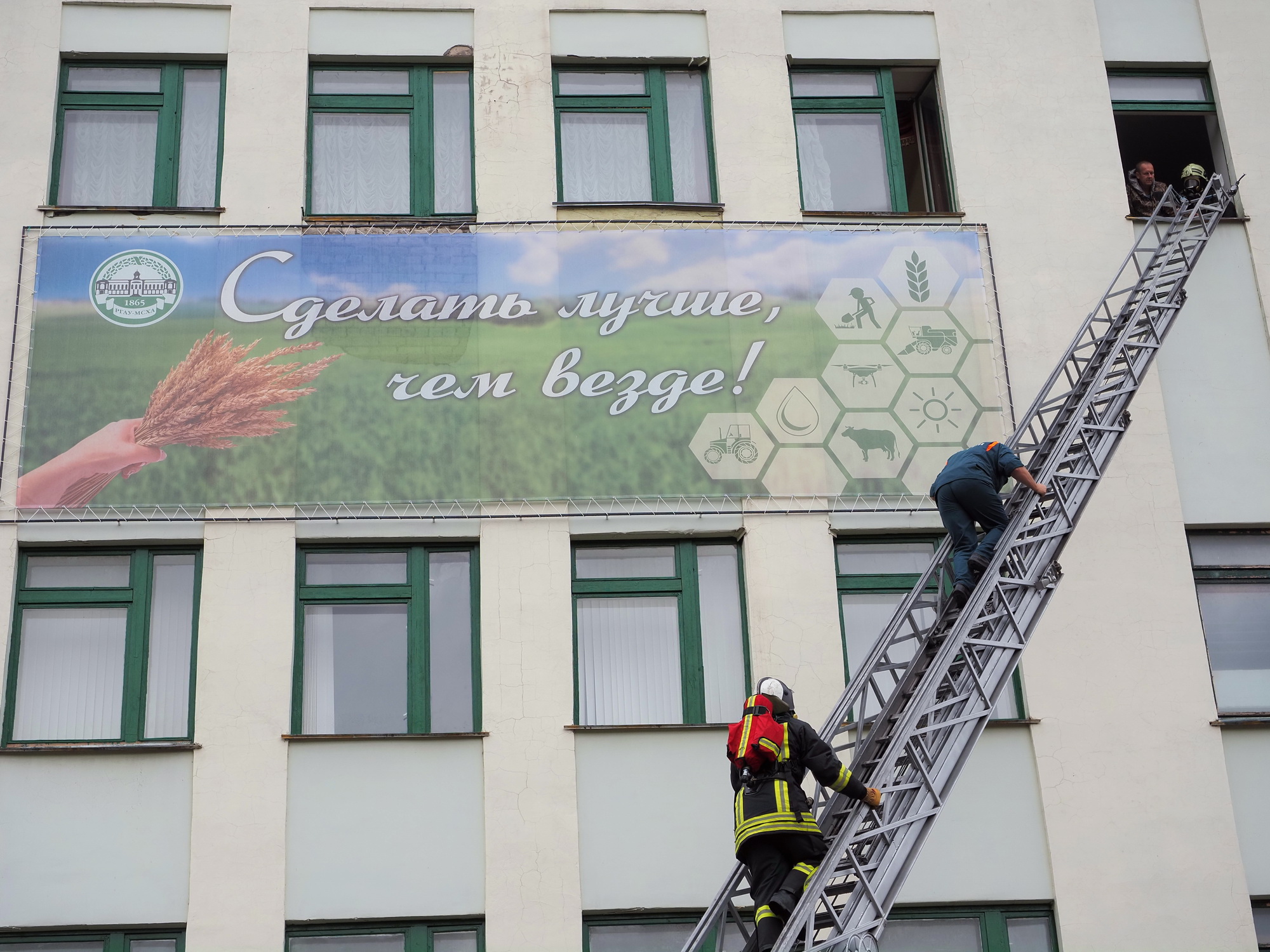 В первую очередь надо было спасти людей. И на реальном, и на учебном пожаре эвакуация - один из самых непростых моментов. Часть «пострадавших» выводили по лестничным маршам, надев на них средства для защиты дыхания – специальные капюшоны, которые подключаются к дыхательным аппаратам пожарных, другие спускались по автолестнице. От момента поступления звонка до полной ликвидации пожара прошло чуть более получаса.