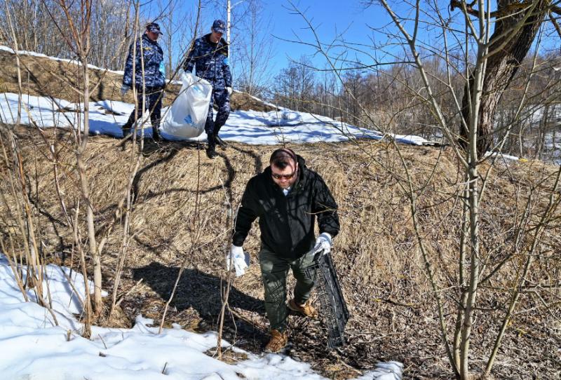 Очистить территорию возле речки вышли школьники, кадеты, волонтеры, сотрудники регионального министерства природных ресурсов и экологии, областной дирекции парков. Из-под снега уже «проклюнулись» пластиковые бутылки и прочий мусор.