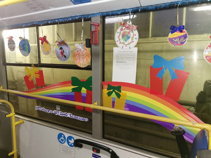Троллейбус, который ходит по восемнадцатому маршруту, к Новому году украсили педагоги и дети Центра развития творчества детей и юношества «Созвездие». Они повесили на окна самодельные елочные шары, приклеили яркую радугу и подарки.