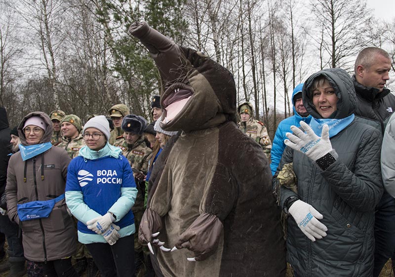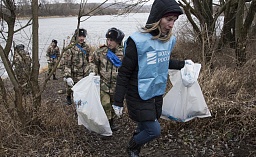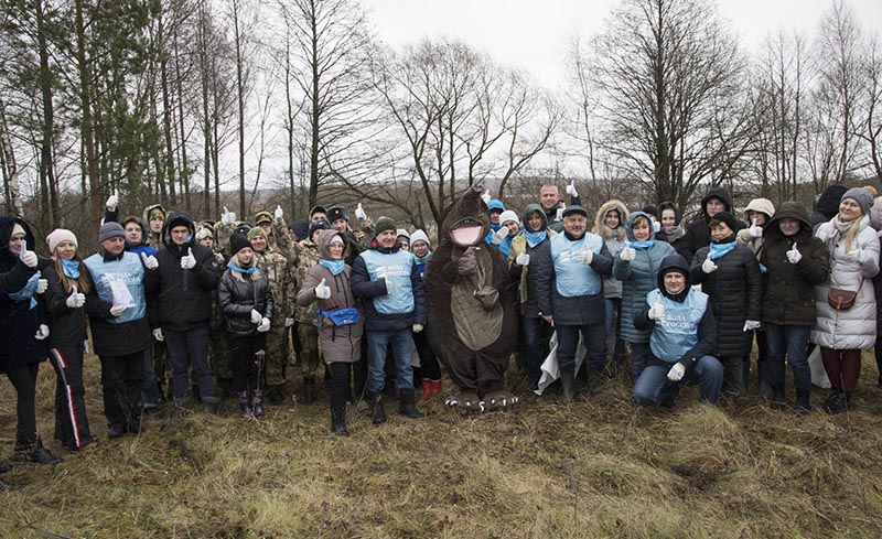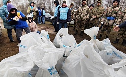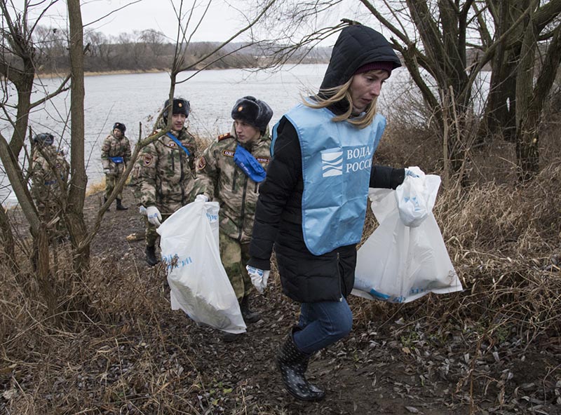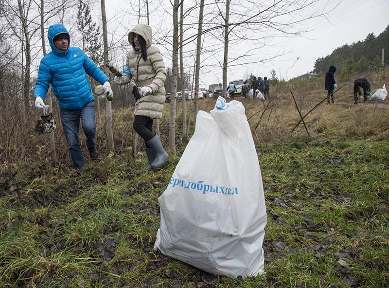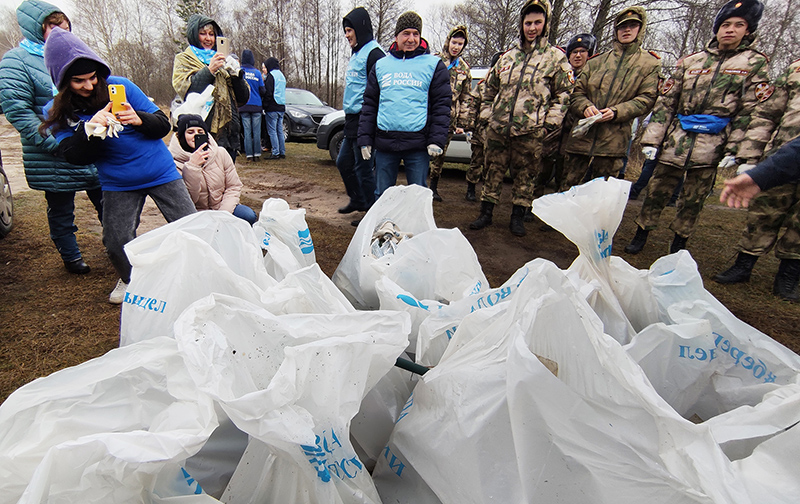 После группового фото и многочисленных селфи с Хохулей волонтеры довольно быстро собрали в мешки мусор с берега Резвани.