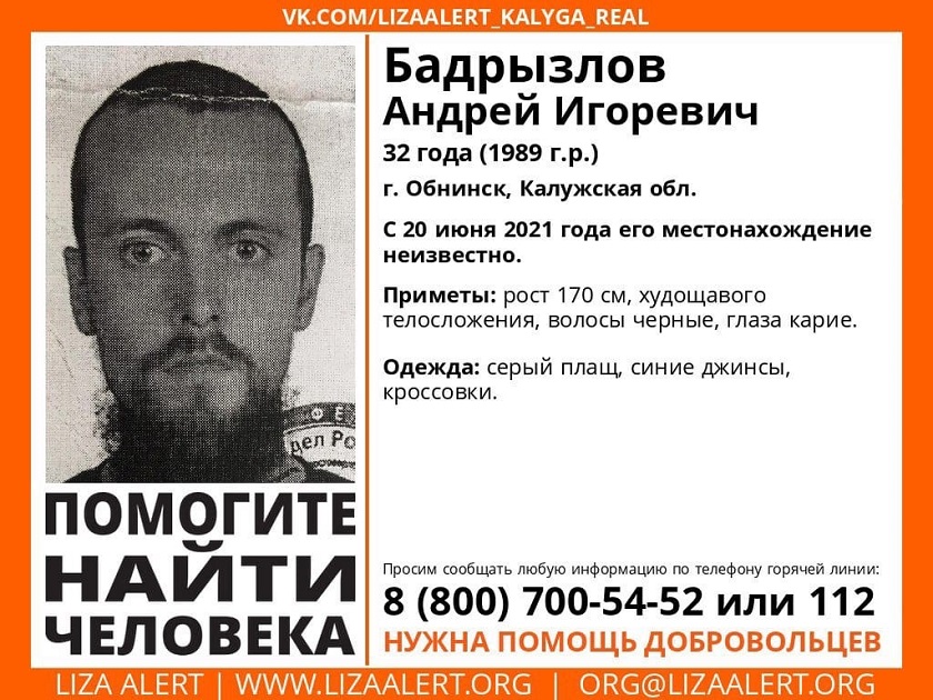 По информации спасателей, Андрей Игоревич Бадрызлов пропал 20 июня этого года. Рост пропавшего - 170 см, худощавое телосложение, черные волосы и карие глаза. Одет Андрей Игоревич был в серый плащ, синие джинсы и кроссовки.