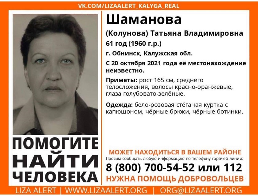В среду, 20 октября, Татьяна Владимировна Шаманова (Колунова) вышла из дома и не вернулась. Как сообщают спасатели, жительнице наукограда 61 год. Рост пропавшей – 165 см, среднее телосложение, красно-оранжевые волосы, голубовато-зеленые глаза.