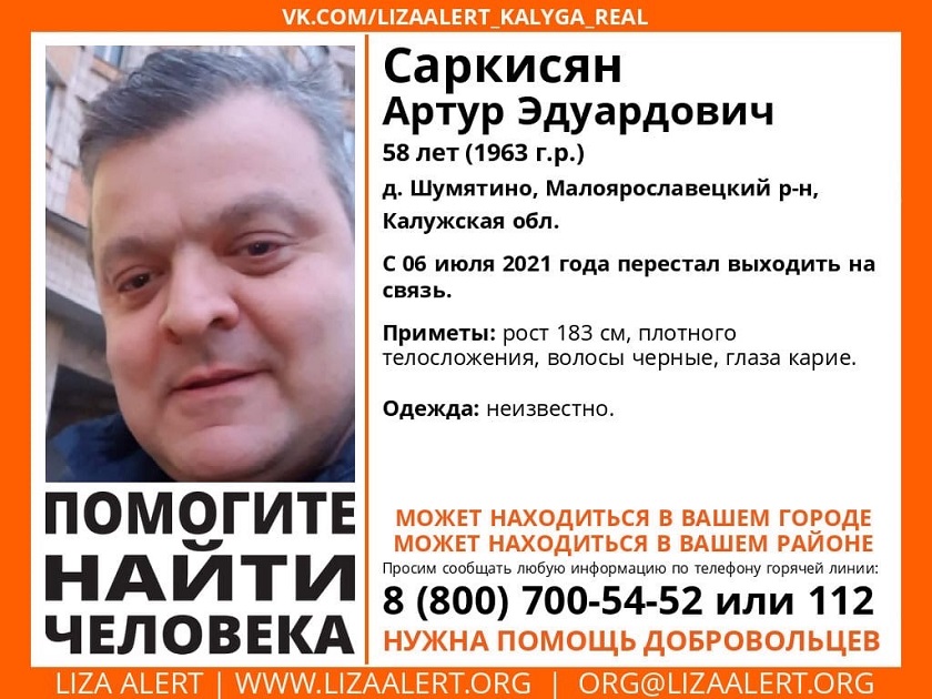 Артур Эдуардович Саркисян проживает в деревне Шумятино Малоярославецкого района. Он не появлялся дома с 6 июля. По информации поисковиков, рост мужчины – 183 см, плотное телосложение, черные волосы, карие глаза. Во что был одет Артур Эдуардович неизвестно.