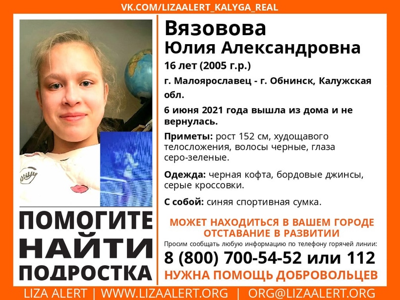 Юлия Александровна Вязовова пропала 6 июня. Около одиннадцати утра она вышла из дома и не вернулась. Предположительно девочка может находиться в Малоярославце или Обнинске.