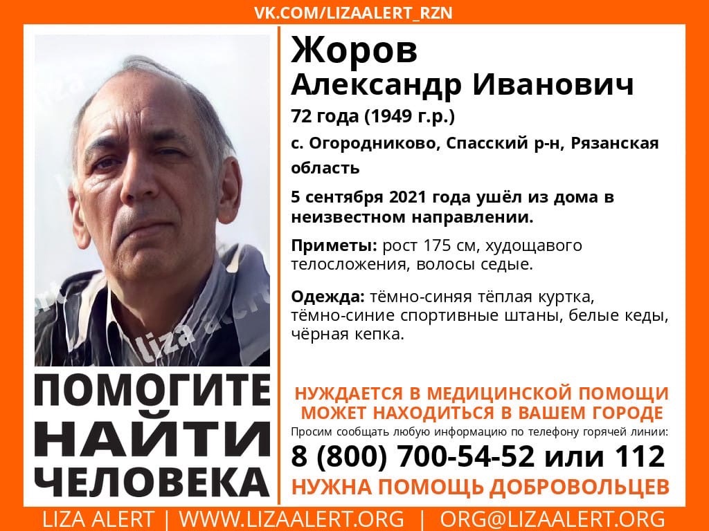 Как следует из информации поисковиков, 72-летний Александр Иванович Жаров проживает в селе Огородниково в Рязанской области. Однако, 5 сентября мужчина ушел из дома в неизвестном направлении и с тех пор его местоположении ничего не понятно.