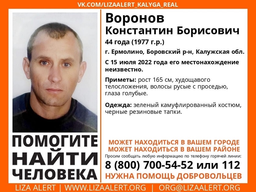 Житель города Ермолино Боровского района Константин Борисович Воронов не выходит на связь с 15 июля. Спасатели приводят приметы пропавшего. Рост мужчины – 165 см, худощавое телосложение, русые с проседью волосы, голубые глаза. Одет Константин Воронов был в зеленый камуфлированный костюм и черные резиновые тапки.