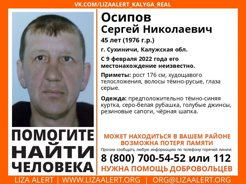По информации спасателей, местонахождение Сергея Николаевича Осипова неизвестно с 9 февраля. В отряде приводят приметы пропавшего: рост 176 см, худощавое телосложение, темно-русые волосы, серые глаза. Одет Сергей был в темно-синюю куртку, серо-белую рубашку, голубые джинсы, резиновые сапоги и черная шапка.