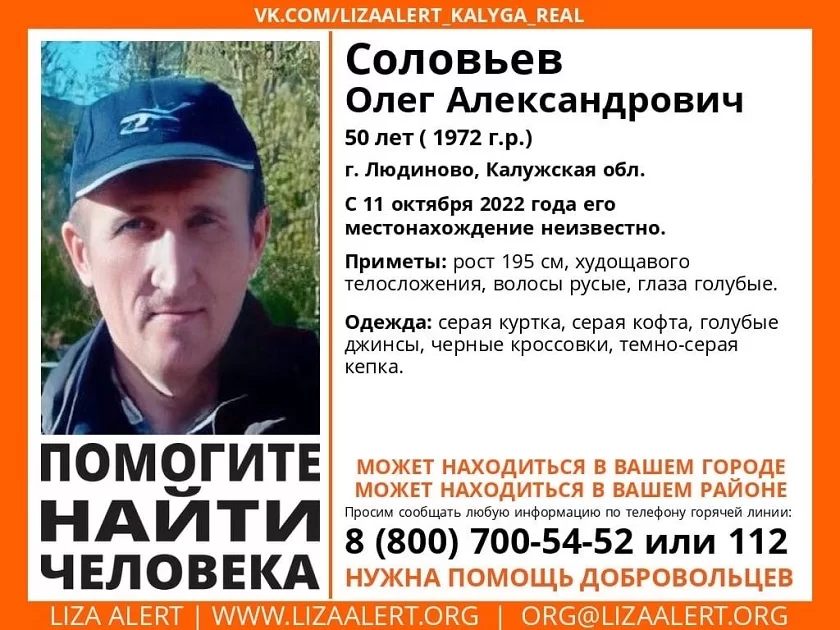 Олега Александровича Соловьева никто не видел с 11 октября. Он проживает в Людинове. Рост пропавшего – 195 см, худощавое телосложение, русые волосы и голубые глаза. Одет Олег Соловьев был в серую куртку и того же цвета кофту, голубые джинсы, черные кроссовки, темно-серую кепку.