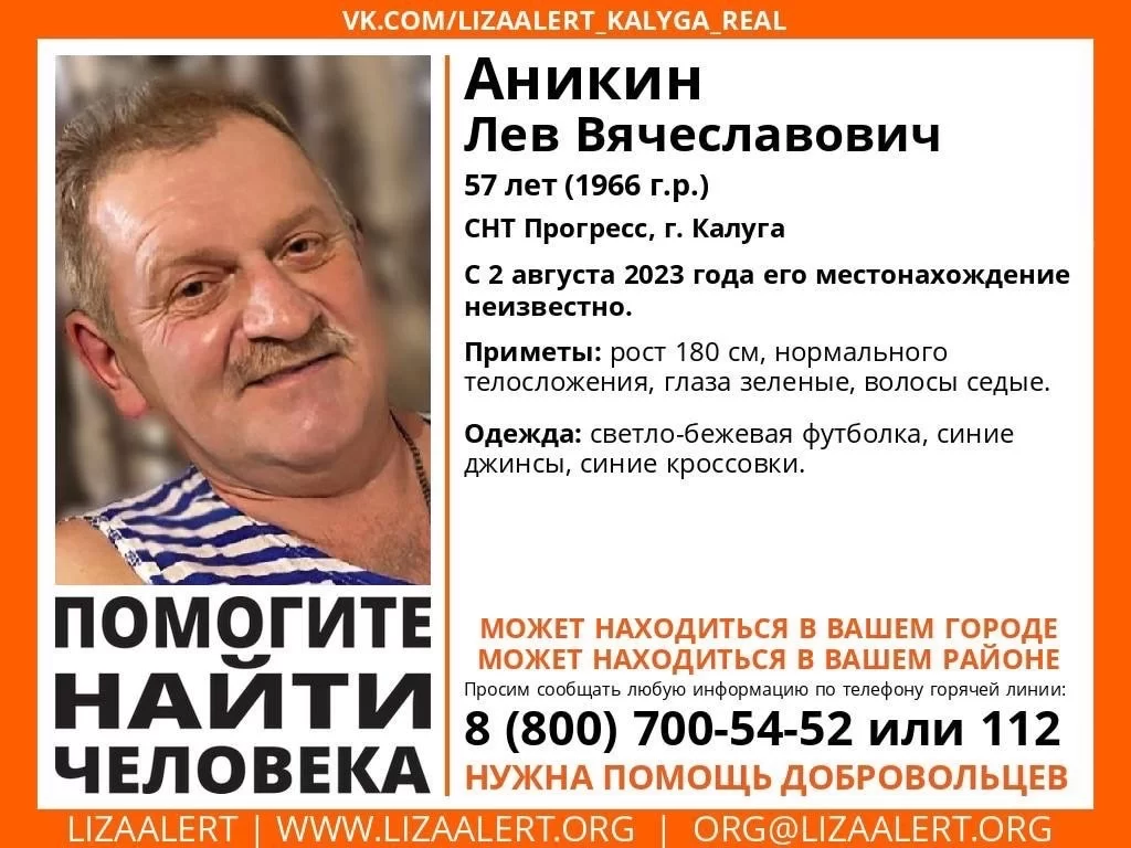 По информации поисковиков, Лев Вячеславович Аникин пропал 2 августа. Рост мужчины – 180 см, нормальное телосложение, зеленые глаза и седые волосы. Пропавший был одет в светло-бежевую футболку, синие джинсы и синие кроссовки.