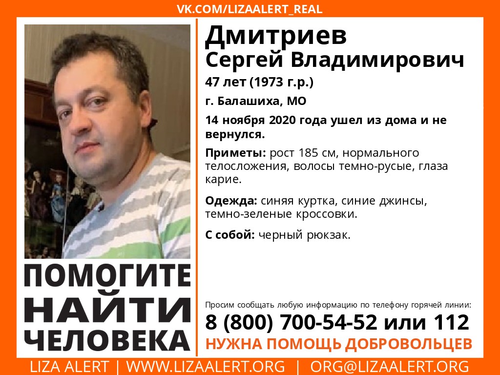 Сергей Дмитриев пропал 14 ноября в Балашихе. Не исключено, что он может находиться в Калужской области.