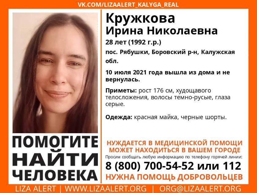 Калужское отделение поискового отряда «ЛизаАлерт» объявило в эту субботу, 10 июля, о поисках 28-летней Ирины Кружковой.