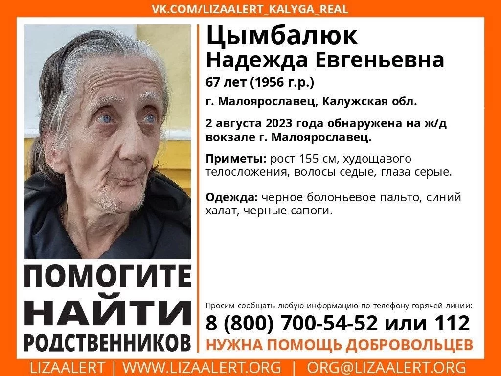 По информации поисковиков, пропавшую 67-летнюю Надежду Цымбалюк нашли 2 августа на ж/д вокзале Малоярославца. Рост бабушки – 155 см, худощавое телосложение, седые волосы и серые глаза. Одета Надежда Евгеньевна в черное болоньевое пальто, синий халат и черные сапоги.