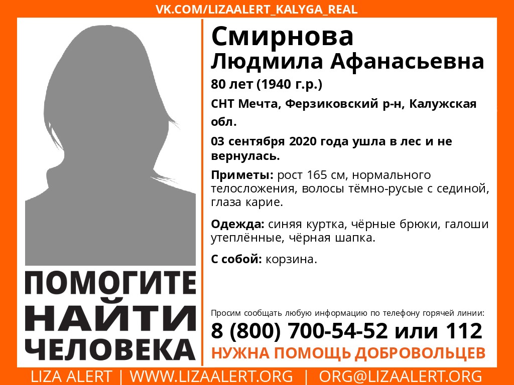 Особые приметы: рост 165, нормальное телосложение, темно-русые с проседью волосы, карие глаза. Когда уходила в лес, была одета в синюю куртку, черные брюки, галоши и черную шапку. С собой была корзина для сбора грибов.