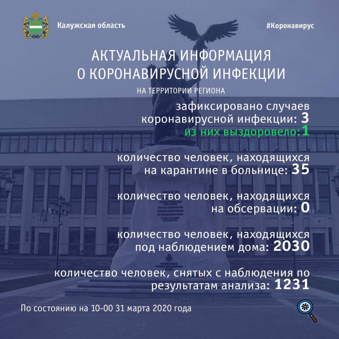 Актуальные данные о ситуации с коронавирусной инфекцией в Калужской области появляются каждый день. Сегодня, 31 марта, свежая информация опубликована по данным на 10 утра.