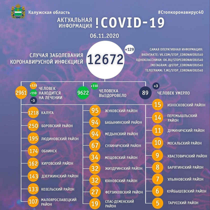 За весь период пандемии в регионе насчитывается 12762 подтвержденных случая заболевания. За последние сутки заболело 129 калужан.